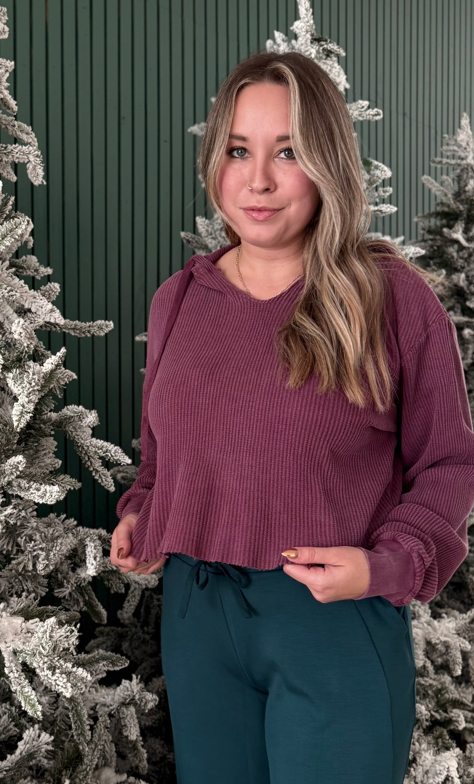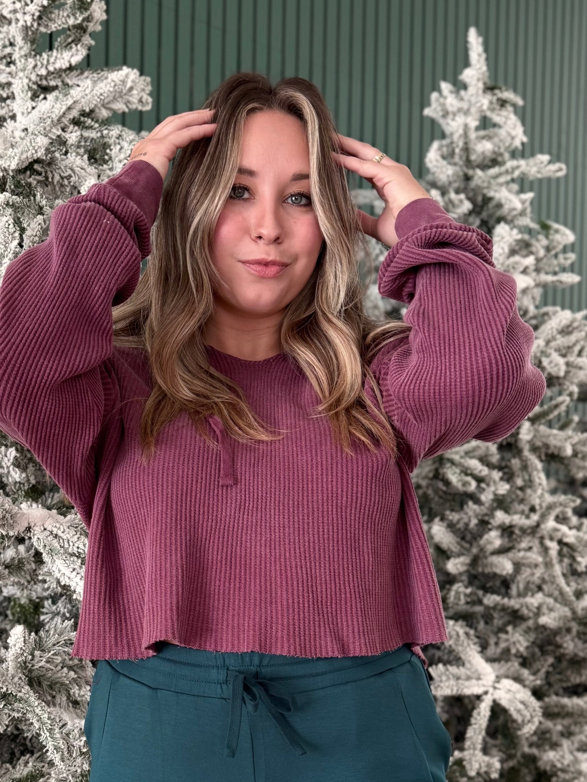 This color is such a vibe this holiday season! Say hello to our newest mineral wash, long sleeve, crop waffle hoodie.. perfect for a casual day out or running errands... Pair it with your favorite vest for a cute and warm, layered look! Lightweight, yet she packs a powerful cozy punch.